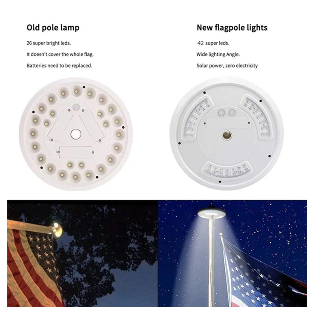 1、42 Ultra-bright LEDs: The light has 42 ultra-bright LEDs to illuminate the flag all night.