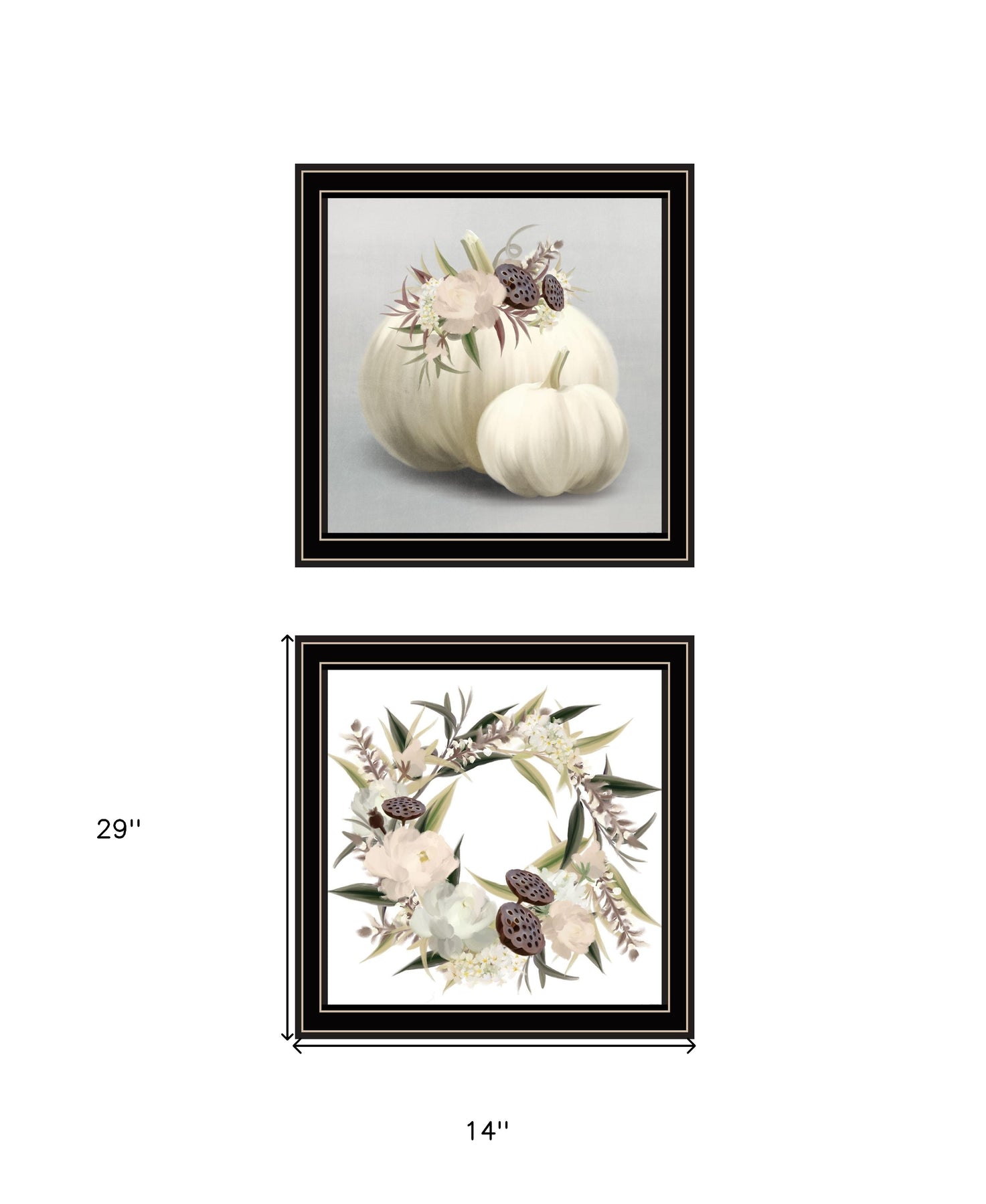 The set of two boho pumpkins and flowers 1 black framed print wall art is the perfect decorative accessory for your home. This print is a visual artistic expression that allows you to decorate your space in style. Reproduced for you on wood, this hanging decorative accent will be a trendy and fashionable way to dress your walls in a rustic and modern farmhouse vibe. Hang on your wall to add some up to date fashion and decoration. Instantly liven up your space with this art that brings color and dimension to your walls. 14-inch H x 29-inch W x 1-inch D