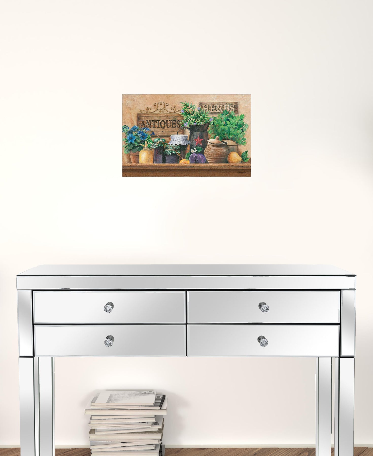 The antiques and herbs 1 white framed print kitchen wall art is the perfect decorative accessory for your home. This print is a visual artistic expression that allows you to decorate your space in style. Reproduced for you on paper, this hanging decorative accent will be a trendy and fashionable way to dress your walls. Hang on your wall to add some up to date fashion and decoration. Utilize this opportunity to create a focal point in the room with this fabulous wall decor option. 11-inch H x 15-inch W x 1-inch D